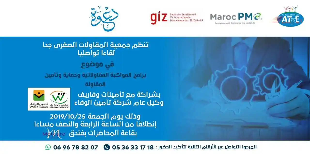 نظمت جمعية المقاولات الصغرى جدا بشراكة مع وفاريف وكيل معتمد تأمينات الوفا لقاء تواصلي في موضوع : “برامج المواكبة المقاولاتية وحماية وتأمين المقاولة” بقاعة المحاضرات بفندق ميركور، بتاريخ 25/10/2019 انطلاقا من الساعة الخامسة مساء.