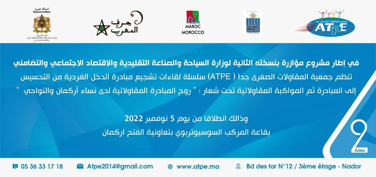 وتأتي هذه السلسلة من اللقاءات التشجيعية في إطار برنامج ”مؤازرة” في نسخته الثانية موضوع اتفاقية الشراكة والتعاون بين جمعية المقاولات الصغرى جدا ”ATPE” ووزارة السياحة و الصناعة التقليدية والاقتصاد الاجتماعي والتضامني والتي تهدق إلى تظافر جهود مختلف الأطراف لمواكبة مسار التنمية المدمجة للنساء والشباب، عبر المساهمة في دعم المشاريع التنمويةوالابتكارات الجماعية والاجتماعية لفائدة مؤسسات قطاعالاقتصاد الاجتماعي والتضامنيذات الأثر الإيجابي على التنمية المستدامة.